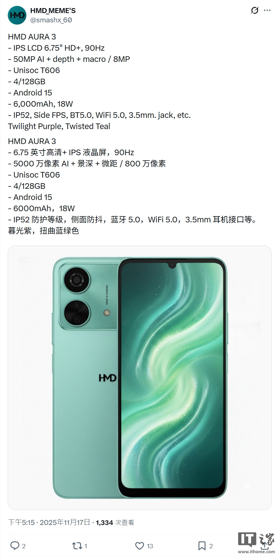 11 月 30 日消息,消息人士 HMD_MEME'S 上周(11 月 17 日)在 X 平台发文,曝光尚未正式发布的 HMD Aura 3 手机。