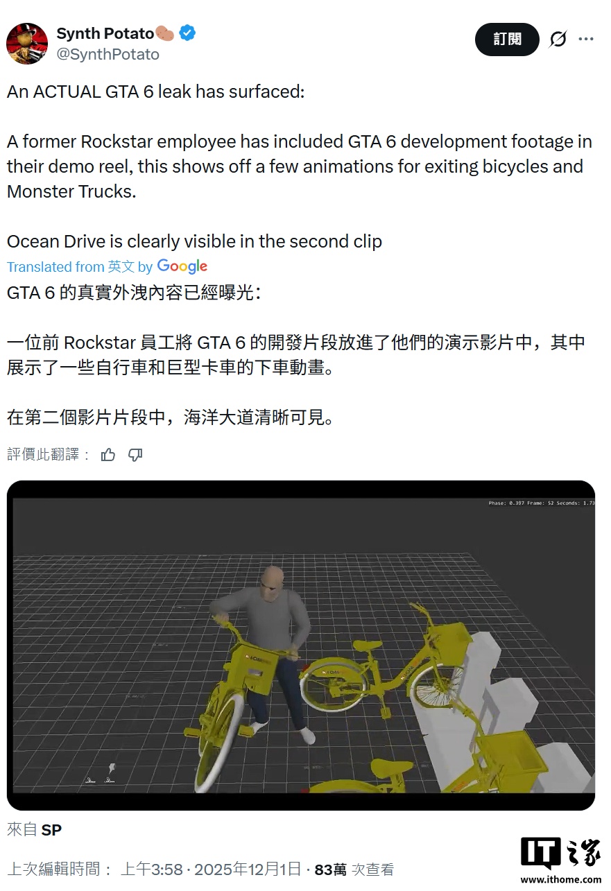 12 月 1 日消息,知名爆料人 Synth Potato 今天在 X 平台发布了一段泄露视频,展示《GTA6》游戏的开发片段。