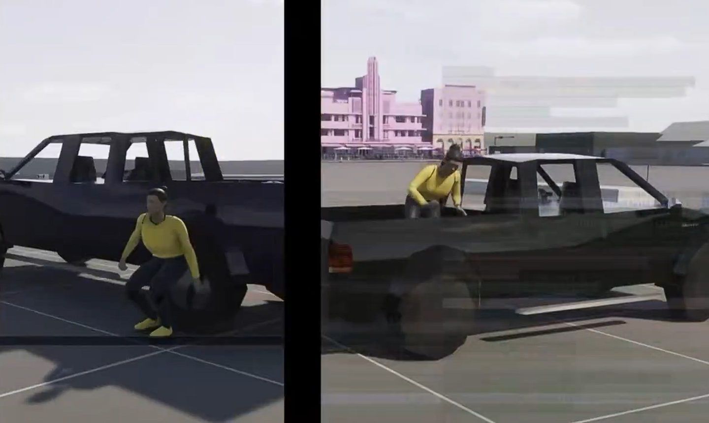 而第二段片段则显示,一位女性 NPC 从一辆皮卡后斗跳下,这名女性的外观与《GTA6》官方预告片中的女主 Lucia 非常相似,暗示着玩家可能会在正式版游戏中搭乘到类似的大型皮卡。