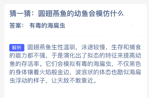以上就是猜一猜:圆翅燕鱼的幼鱼会模仿什么?神奇海洋今天答案最新2025年11月30日分享,更多相关攻略内容,请点击关注本站手游网更新!