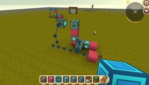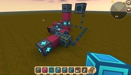 2、然后我们继续搭建+号方块和-号方块,当然图一滑动方块后面的辅助方块换为电能线,第二个浮空滑动方块也同样需要辅助方块来辅助调整朝向;