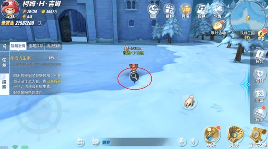 搜索抗生素的线索,有两个线索在城堡门外,两个线索在城堡内部(城堡大门口进入),粉红色的雪注意下。