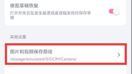 3、进入相机设置页面后,向下滑动屏幕,在众多设置选项中找到图片和视频保存路径选项,这里就是草稿的保存位置。