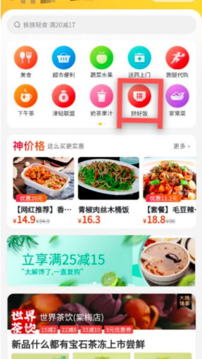 1、拿出手机打开美团外卖APP或微信小程序,进入首页后,在众多功能选项中找到并点击拼好饭。