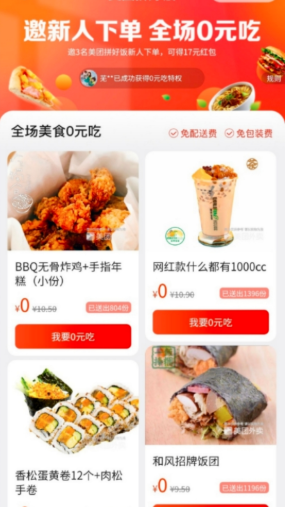 2、进入美团拼好饭页面,新用户可看到全场0元吃活动,若想获得免单特权,只需邀请3名新人参与即可。