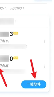 2、在待取件页面中找到一键取件按钮并点击,页面展示出待取包裹列表。