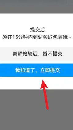 4、仔细阅读系统提示,明确需在15分钟内到驿站领取包裹,确认无误后点击立即提交。