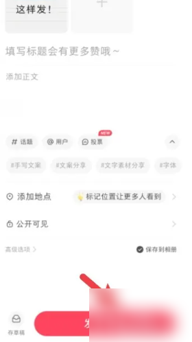 3、进入内容编辑页面,在编辑框中编辑正文内容,可添加标题、话题标签等相应信息,确认无误后点击“发布笔记”按钮。