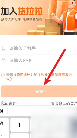 2、进入货拉拉司机版初始页面后在页面中找到登录入口点击登录选项并在弹出的登录界面输入事先注册好的账号。