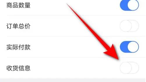 5、在“编辑核对订单字段”页面查看“收货信息”旁滑块状态若为点暗点击点亮即可让核对订单时显示收货信息。
