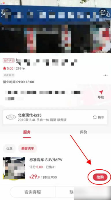 4、在洗车行详情页了解其位置营业时间等信息后,确定要选择就点击“抢购”锁定服务。