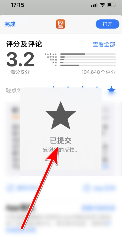 4、系统弹出【已提交】的提示,即可给芒果TV应用评分。