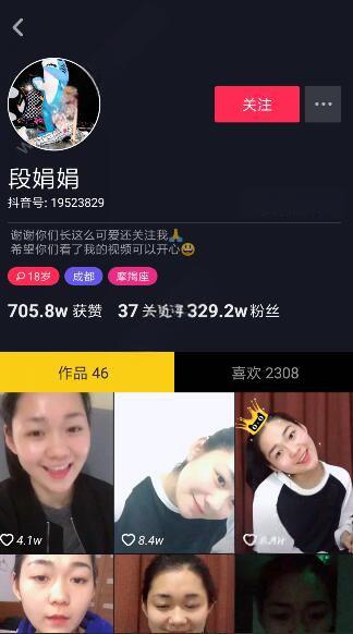 1、段奥娟在抖音的账号号码为19523829昵称叫段娟娟,在全民K歌上的用户名字是“段大娟”方便粉丝查找关注。
