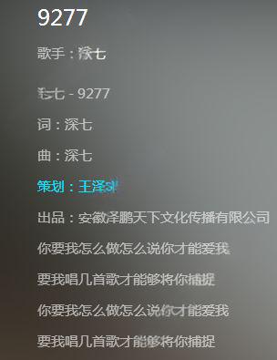 1、首先揭晓答案,这句歌词出自歌曲《9277》,由歌手深七演唱,在抖音上引发了广泛传播。
