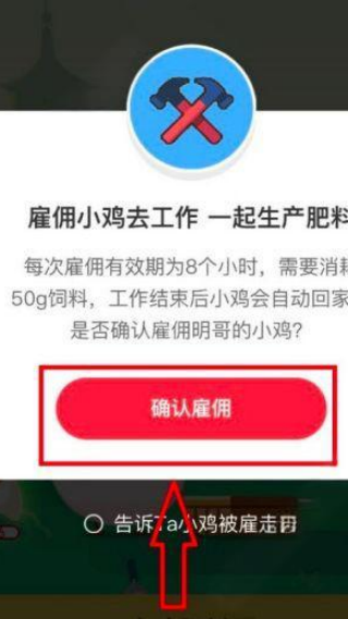 4、选中想要雇佣的小鸡,点击“雇佣”按钮,消耗50克饲料作为雇佣成本,即可让小鸡开始8小时的打工任务。