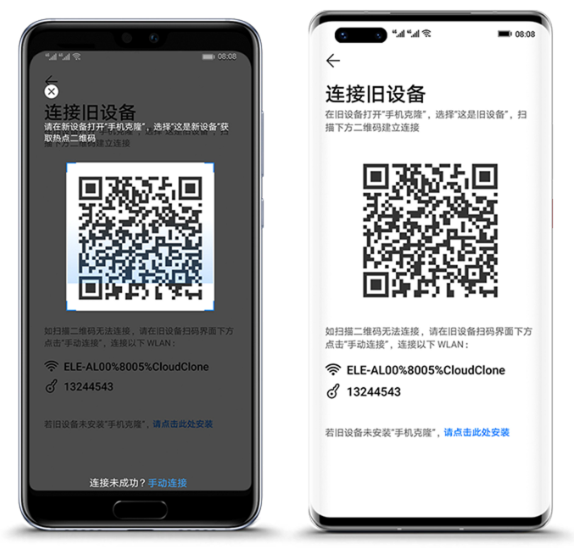 用旧手机扫描新手机上出现的二维码,连接新旧手机。