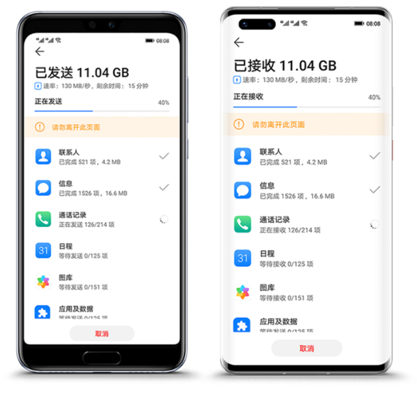连接后,在旧手机中选择要克隆的数据,点击【开始迁移】,等待【迁移完成】即可。