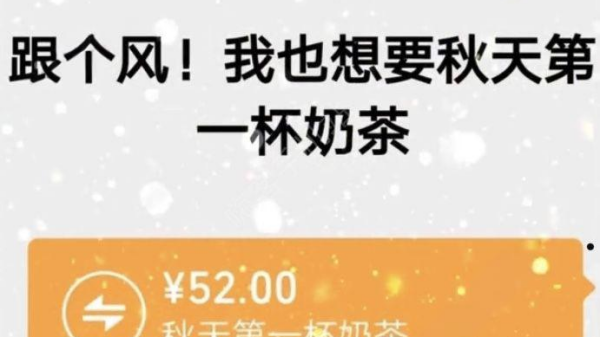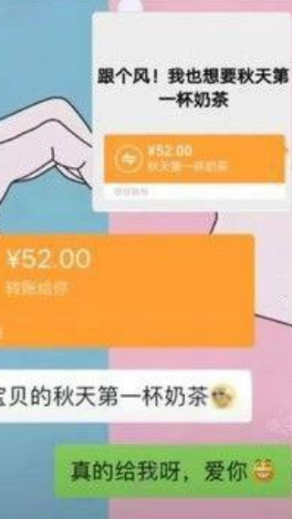 1、爱意传递新形式:秋天天气转凉,一杯热乎乎的奶茶能带来温暖。情侣间,发52元红包请对方喝秋天第一杯奶茶。