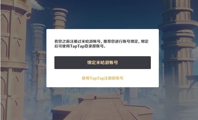 当玩家首次使用TapTap账号登录后,会出现下面的提示框,此时可以直接绑定。