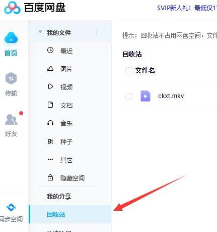 1、打开百度网盘以后,我们可以在左侧栏中看到“回收站”,点进去。