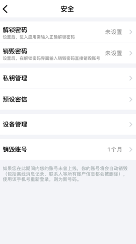7、再点击“安全”按钮进入安全界面后,选择下方的“销毁账号”并将时间设置为立即销毁。这样就能直接删除本机的所有聊天记录及联系人。