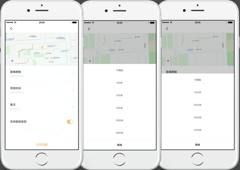 不限、50米、100米、300米、500米、1000米、1500米,后台签到判断距 离加上10%米数,选择距离后,坐标位置发散对应距离覆盖物。