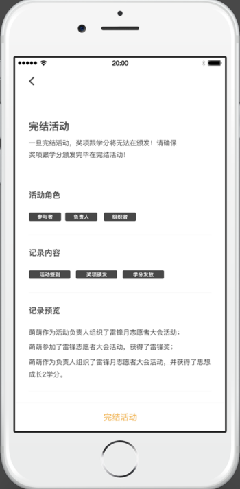 (活动完结后已颁发的奖项和学分将无法撤回,学分将进入个人账户,同时生成成长记录,无法更改,请务必在颁奖和发放学分再完结活动。)