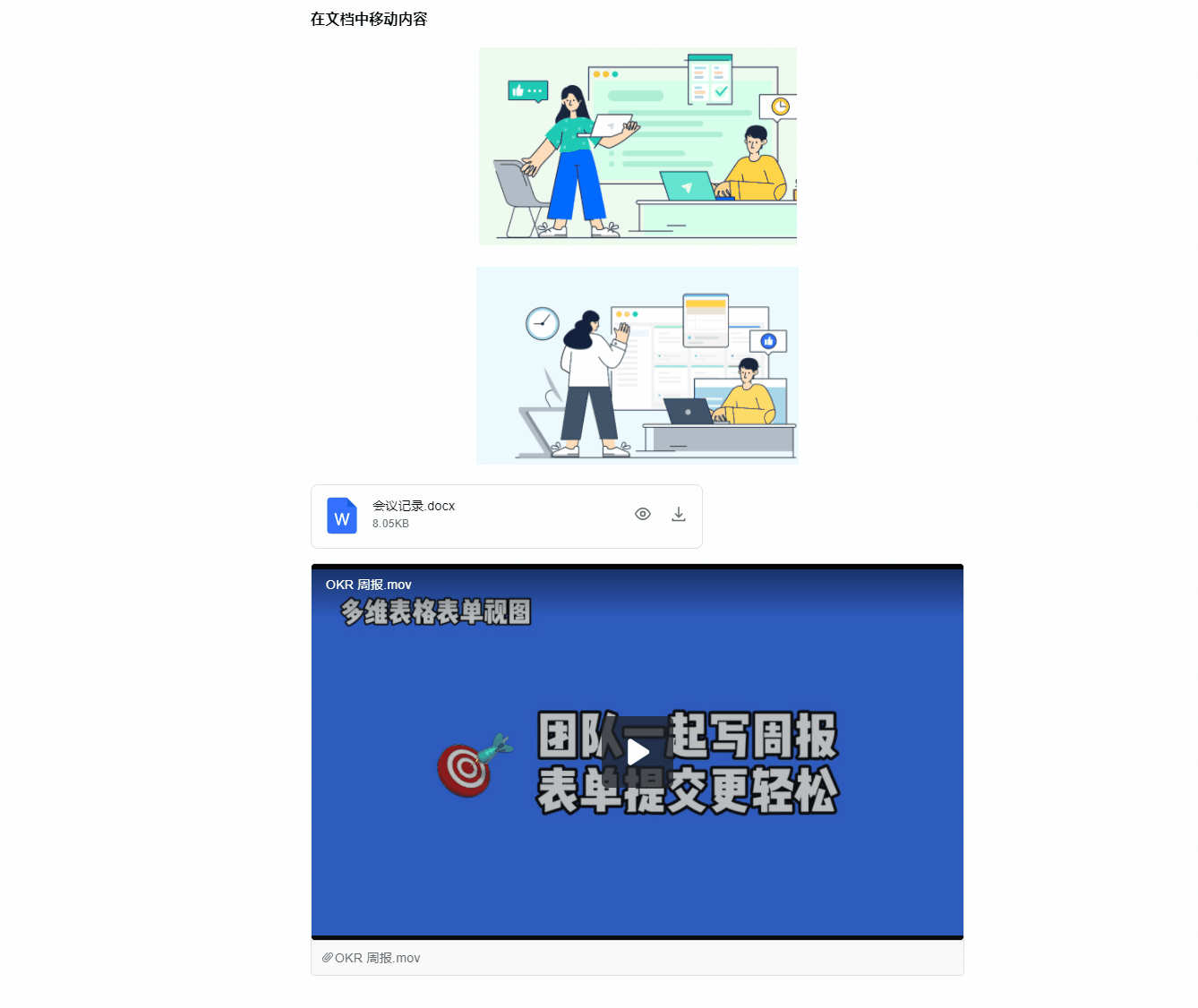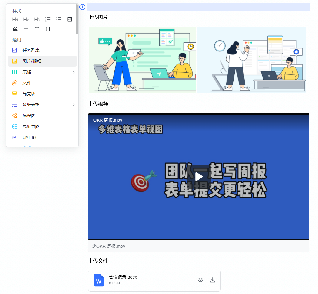 鼠标悬浮在空白行的+按钮,唤起工具栏,选择图片/视频,插入文档的视频可直接播放。