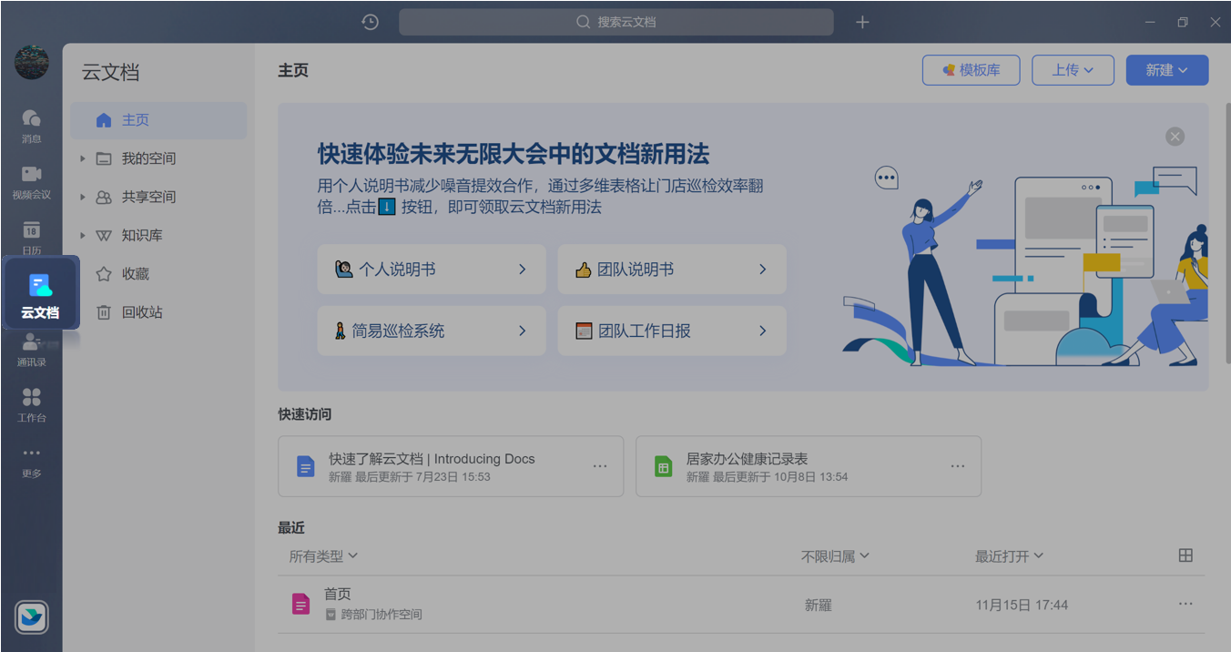 点击左侧边栏的云文档图标,即可进入云文档客户端主页。