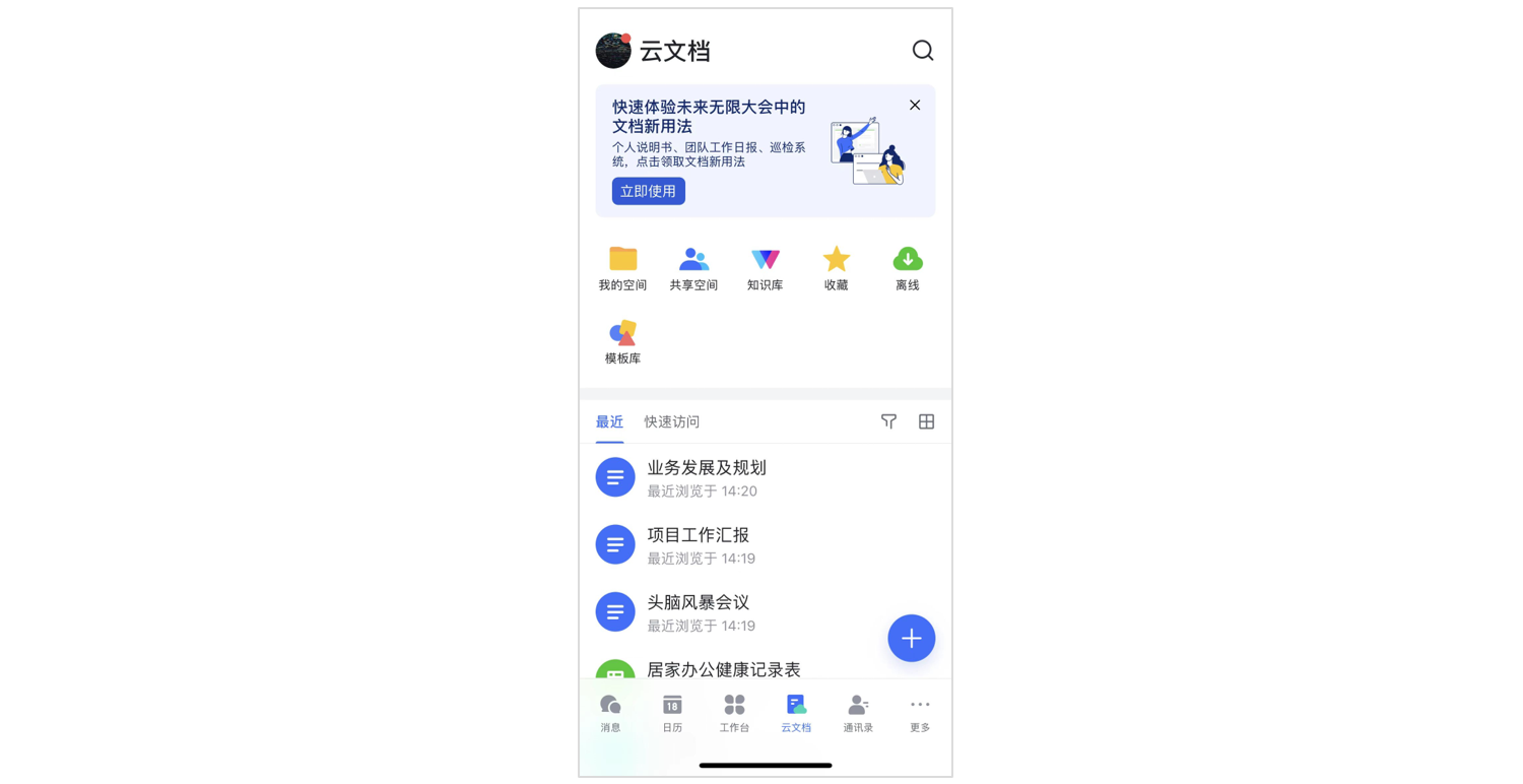 在移动端页面的底部导航栏点击云文档图标,即可进入云文档移动端主页。