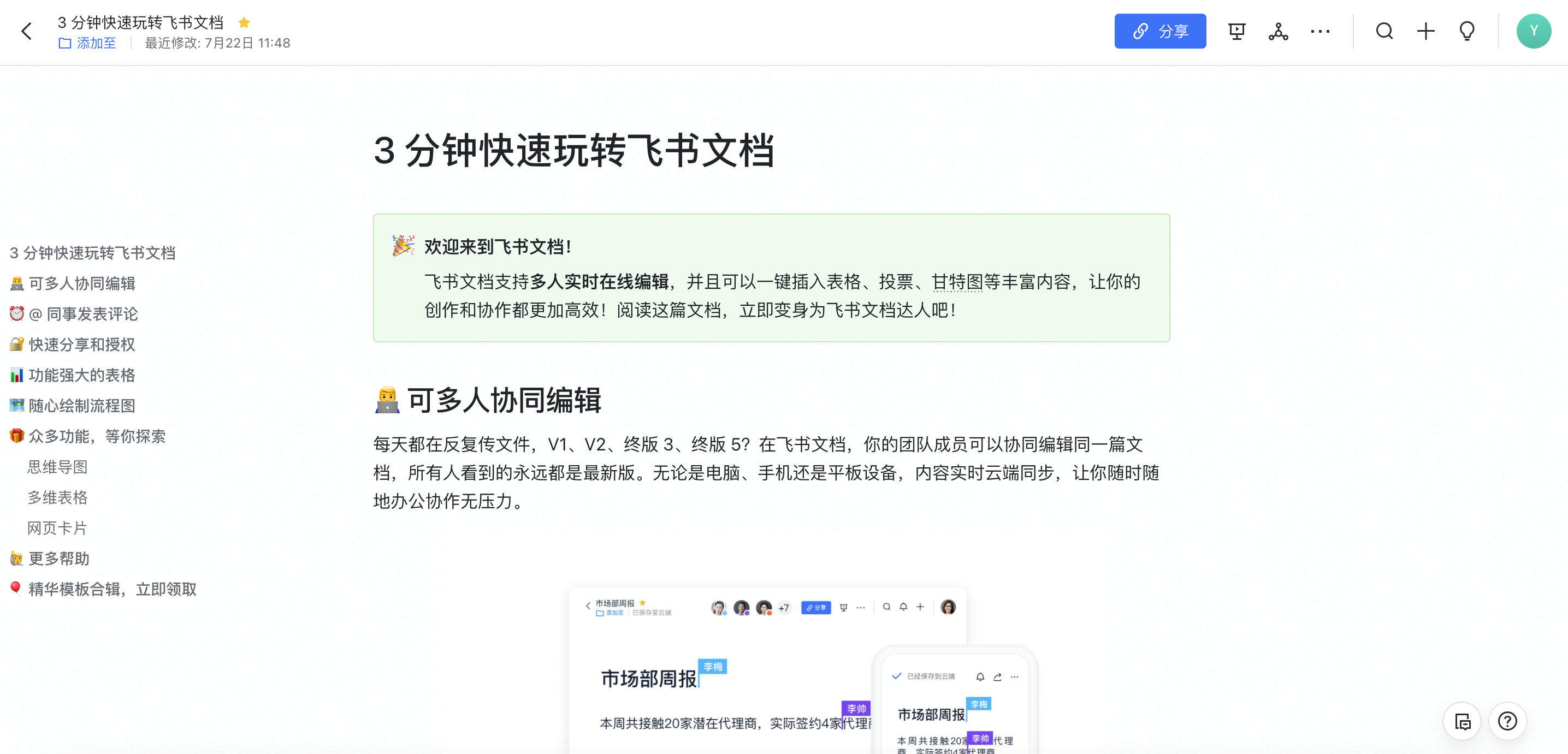分享:与他人分享文档,调整协作者的权限,修改文档分享设置演示:使用演示功能,全屏展示文本内容...:支持查找和替换文本内容、添加至文件夹、创建副本、删除、举报等多项操作文档关系图:查看你有权限访问的文档间的引用关系高级搜索:快速搜索某篇文档、表格或文件夹+:快速新建文档、表格,上传新文件至云文档功能更新:当云文档有功能更新时,此处会有通知任务中心:在文档的任务列表中,通过 @ 提及你并授予编辑权限的任务都会显示在此,方便统一管理个人头像:设置语言、权限、英文拼写和语法,查看帮助中心,或是退出登录表格