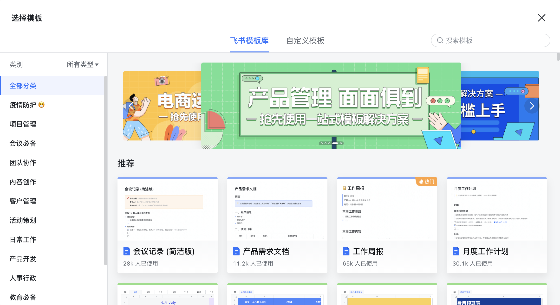 你可以在主页面顶部切换飞书模板库或自定义模板,在右上角的搜索框搜索需要的模板。