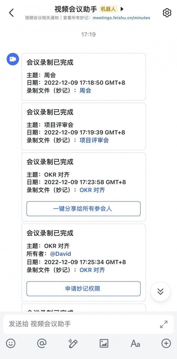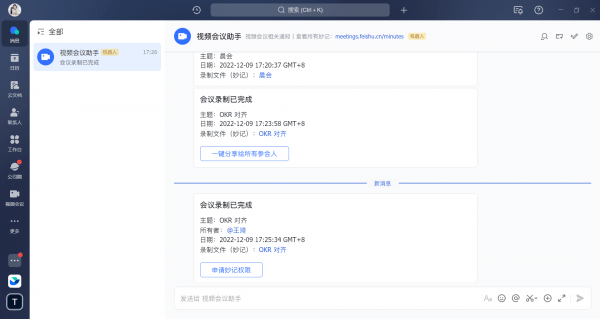 会议结束后,录制内容归属者会收到视频会议助手的推送,点击推送中的录制文件链接即可打开生成的妙记文件。