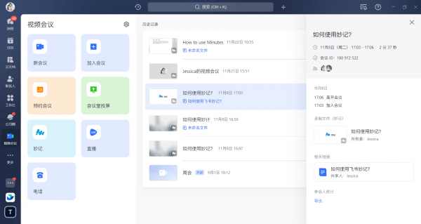 点击飞书侧边栏的导航栏视频会议后,选择妙记即可进入妙记主页。