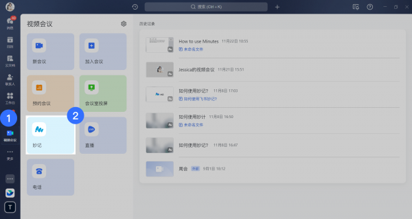 点击飞书侧边栏的导航栏视频会议后,选择妙记即可进入妙记主页。
