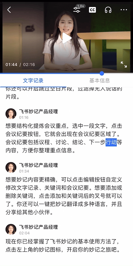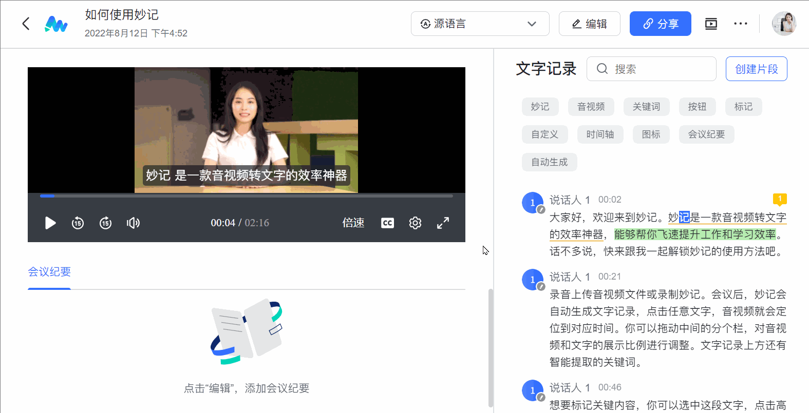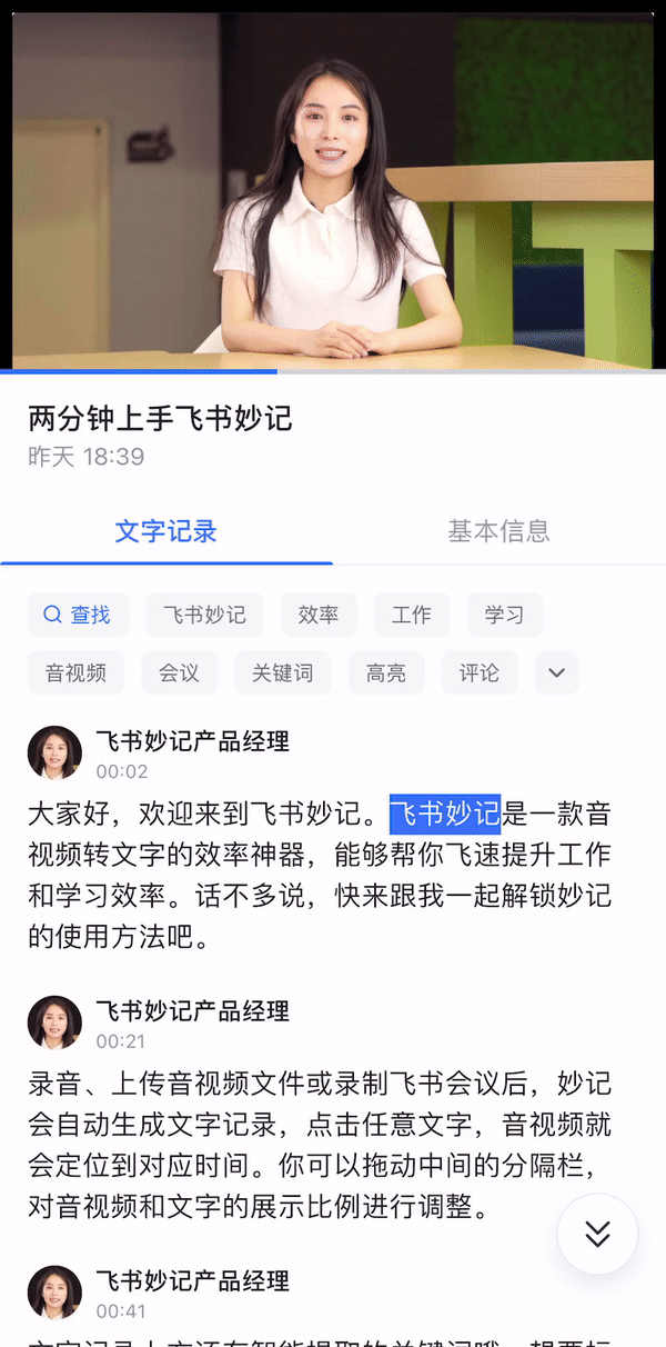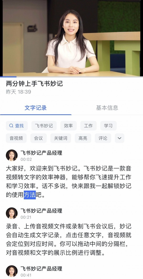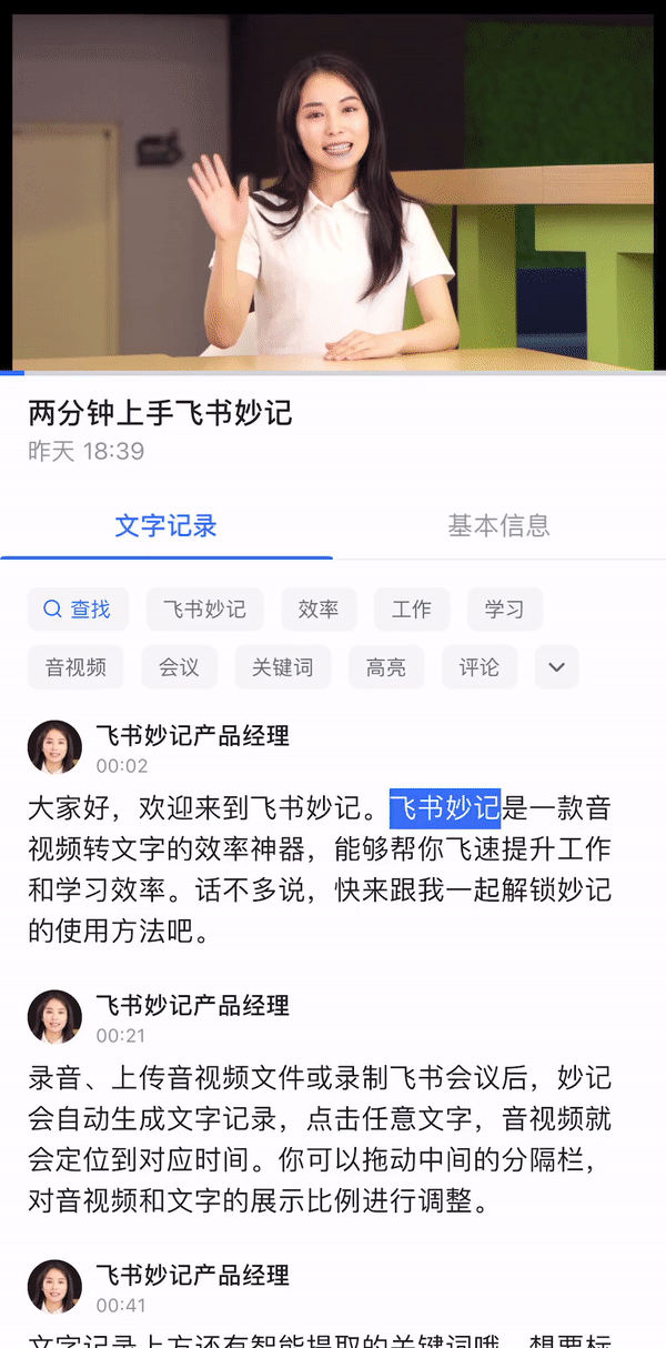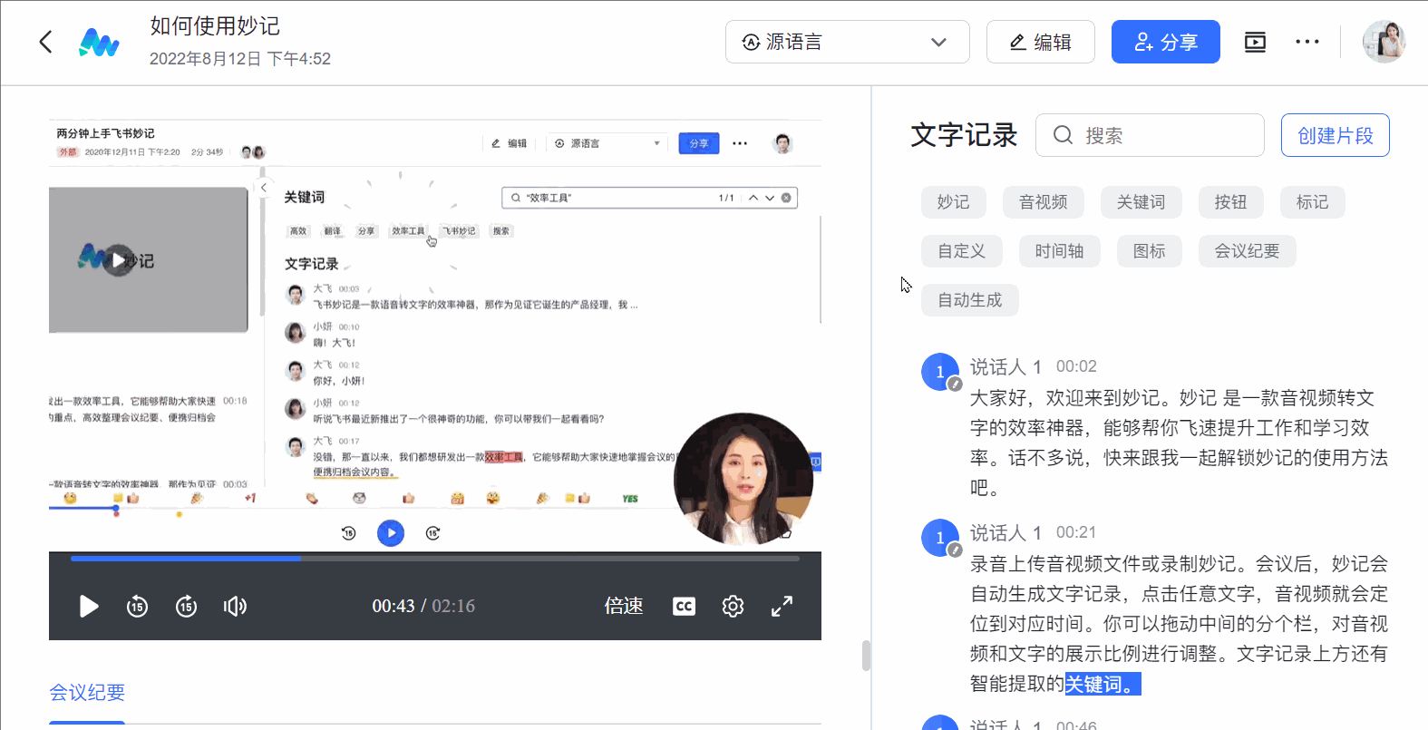 打开妙记文件后,可以看到系统自动生成的文字记录和基本信息,以及智能提取的关键词。音视频内容播放时,对应的文字内容同步显示高亮。
