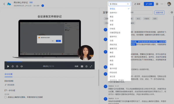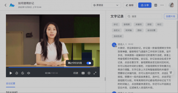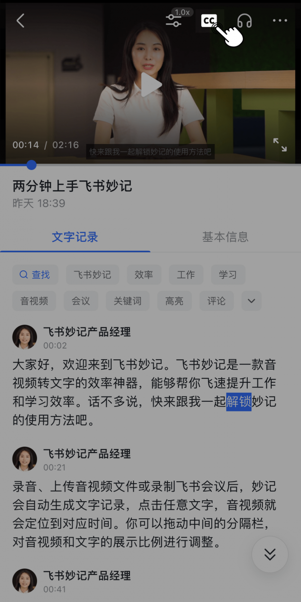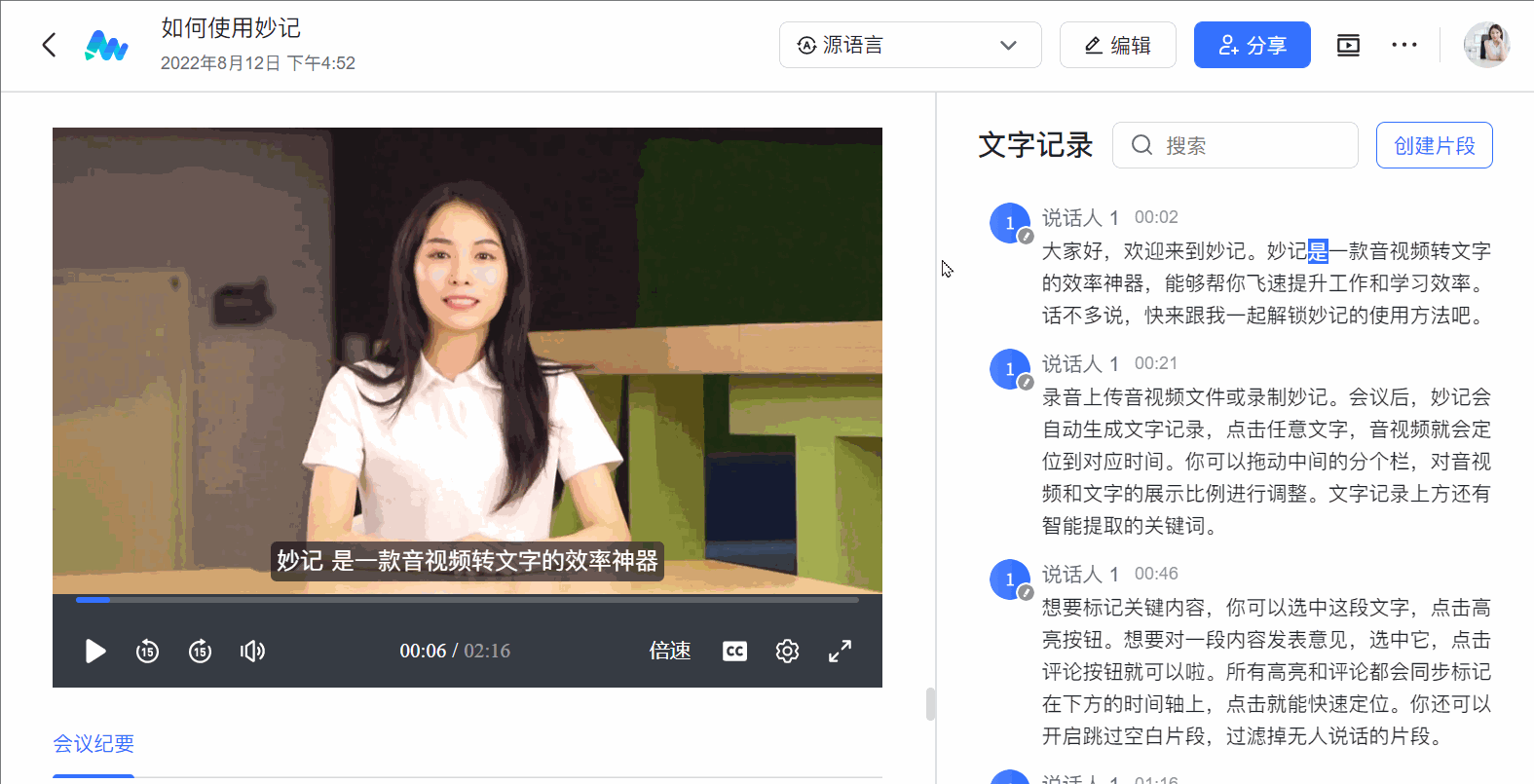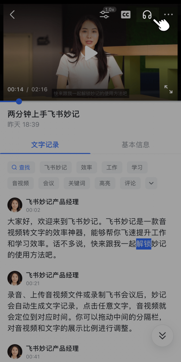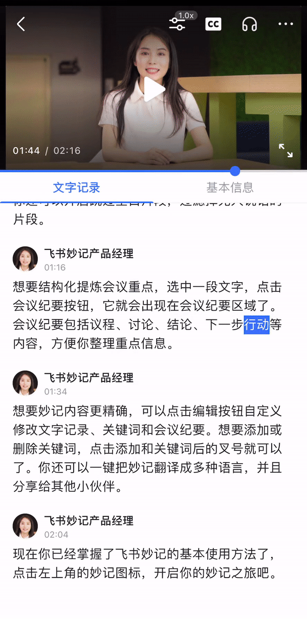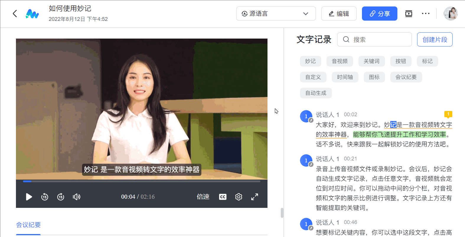打开妙记文件后,可以看到系统自动生成的文字记录和基本信息,以及智能提取的关键词。音视频内容播放时,对应的文字内容同步显示高亮。