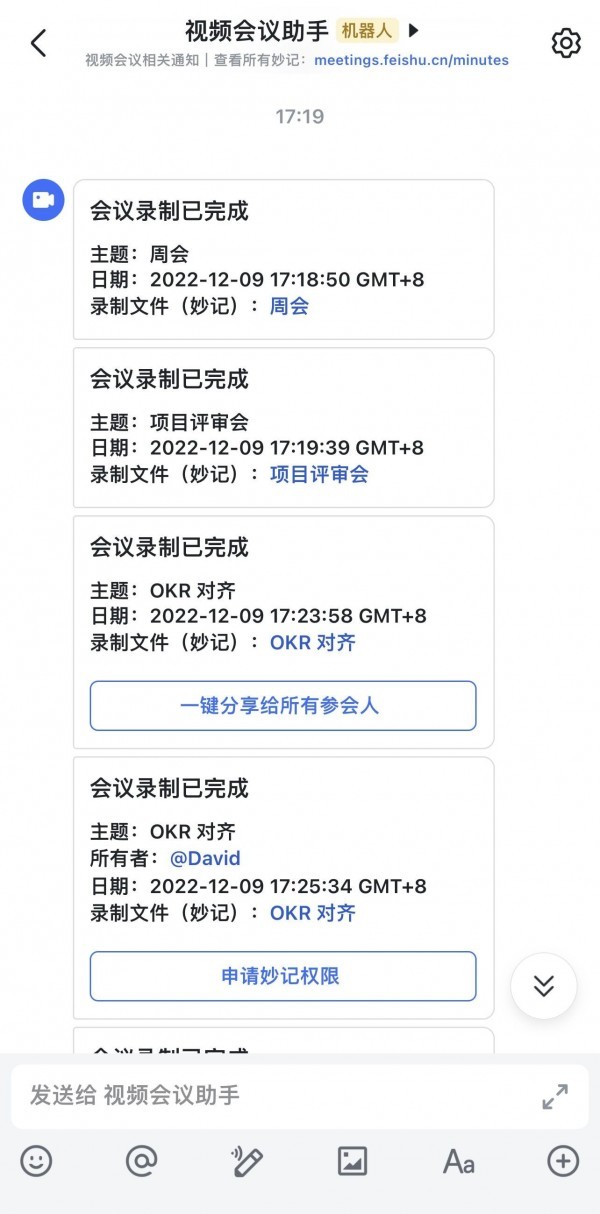 若会议从提前创建的日程中发起,妙记将发送给日程组织者。