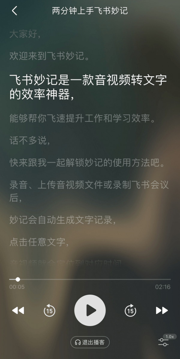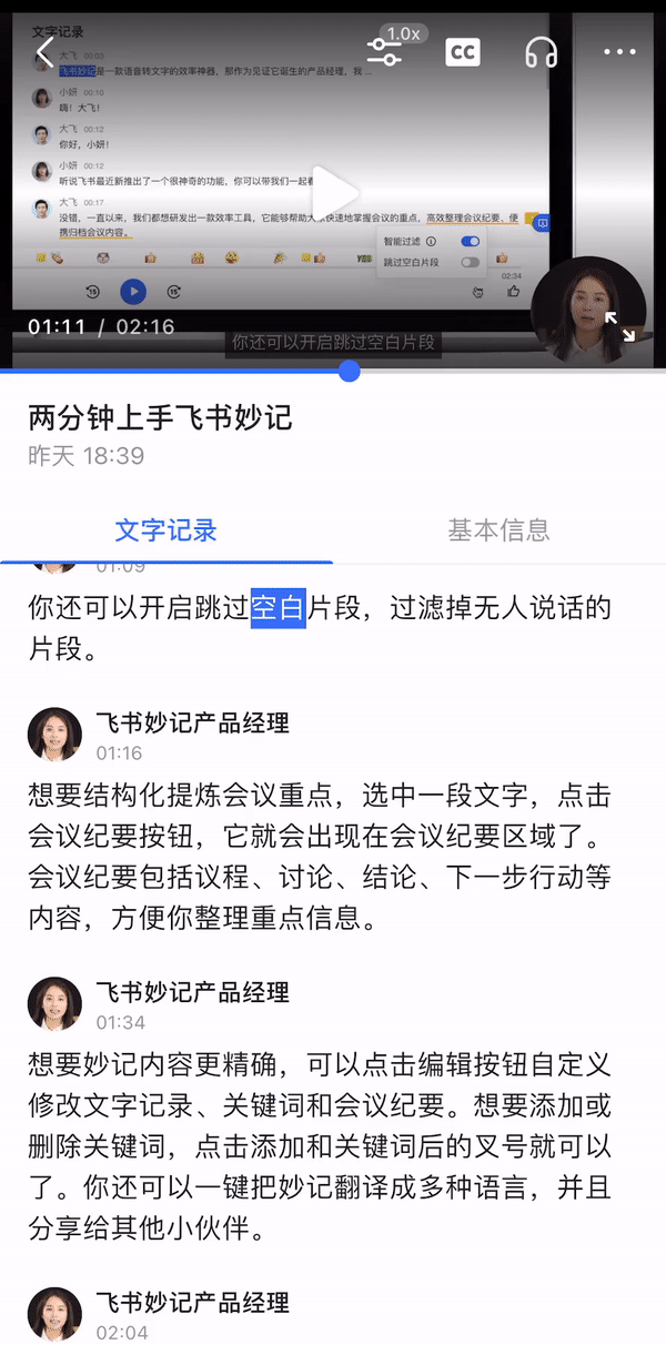 在播客模式详情页,所播放的音频对应的文字会实时高亮,就像歌词一样。你可以一边听音频,一边看字幕辅助理解。在播放时,自由切换妙记文件和倍速,还可以开启跳过空白片段,提升回听效率。