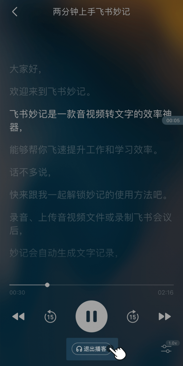 在播放妙记视频时,点击视频画面唤起控制菜单,点击屏幕右上方的播客模式按钮即可进入播客模式。