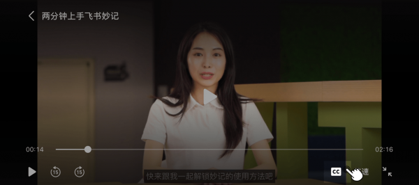 在播放妙记视频时,点击视频画面唤起控制菜单,点击上方的CC字幕图标,即可开启或关闭字幕。字幕默认关闭。