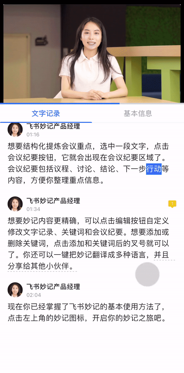 在阅读会议纪要时只需要点击文字,即可跳转到对应的进度条节点,观看对应内容。