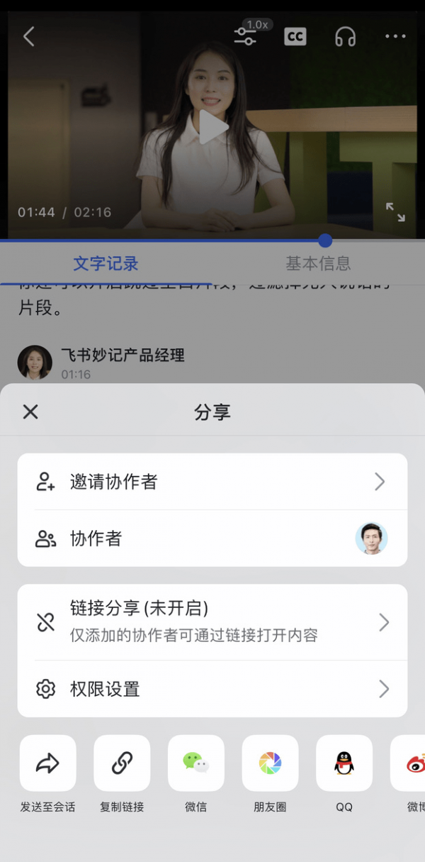 点击右上角的分享>链接分享,打开链接分享,复制网站链接,即可进行内容的分享,被分享者打开链接即可进入妙记内容界面。在链接分享界面,你还可以设置内容分享的范围和编辑权限。