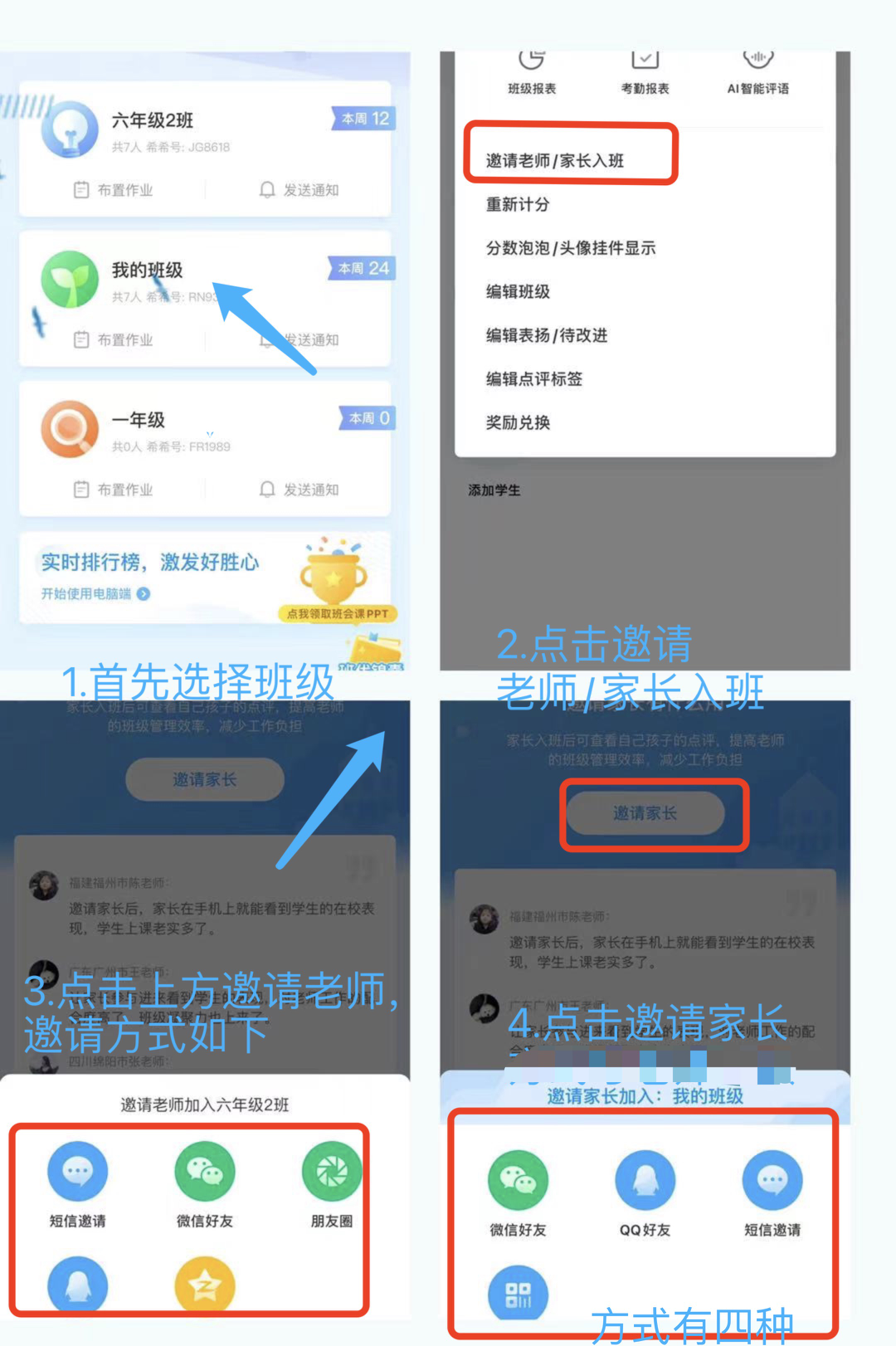 我们需要点击进入班级,选择右上角“…”后,邀请老师/家长入班,按照提示就可以生成二维码。