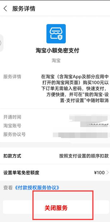 5、最后在小额免密支付的页面中点击【关闭服务】即可;