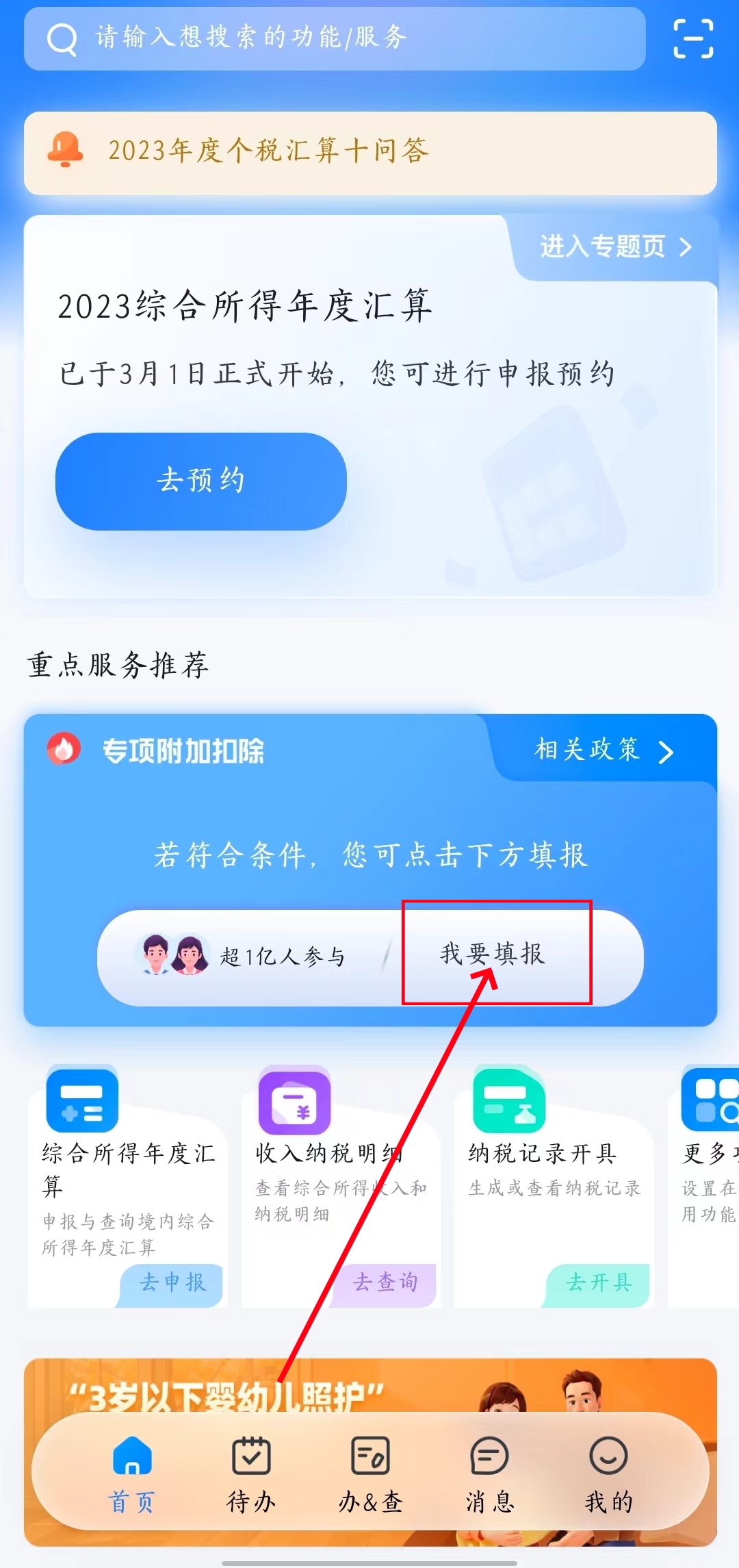 1、首先打开app登录,进入主页面,点击【专项附加扣除】的【我要申报】。
