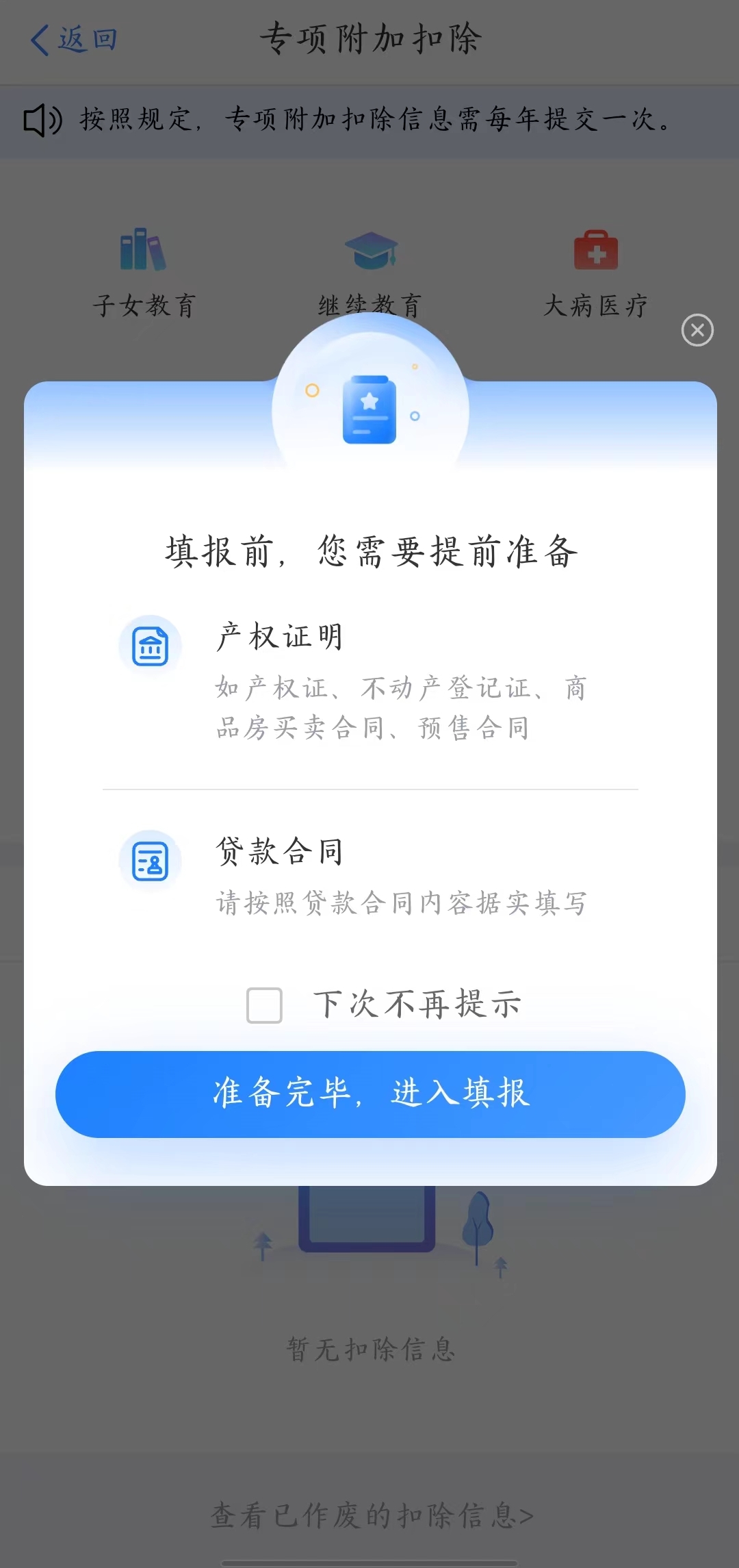 3、准备好如图所示的相关信息,点击【准备完毕,进入填报】开始填写。