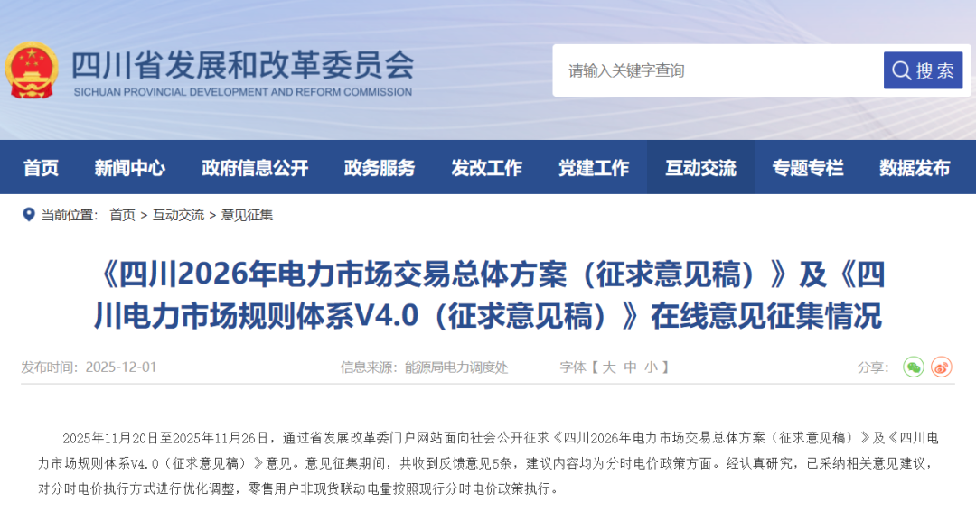 12月1日,四川省发展和改革委员官网发布了《四川2026年电力市场交易总体方案(征求意见稿)》及《四川电力市场规则体系V4.0(征求意见稿)》在线意见征集情况。