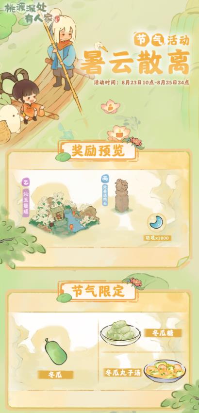 山民在活动期间内,可种植特殊农作物「冬瓜」和制作特殊节气菜肴「冬瓜糖」「冬瓜丸子汤」,提交节气订单可以额外获得玥琅。萝萝山已准备好了本期的节气限定建筑,山民记得参与活动获取玥琅,不要错过兑换时间萝!