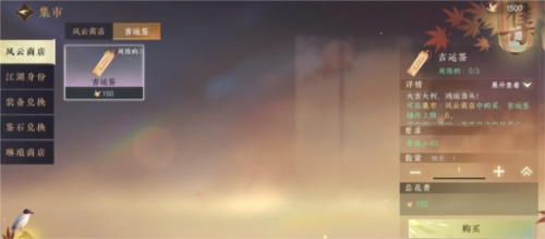 吉运签可以在界面右上角的商城——风云商店——吉运签中花费150活力值购买,每周最多可以购买3个吉运签。除了在商城中花费活力值购买外,还可以等待通关舞阳城•六尊使后解锁配方,解锁配方就能以药师的身份花费一定量的活力值制作吉运签。吉运签的获取需要花费的活力值较高,剩余的活力值需要选好副本,以获取更好的道具奖励。